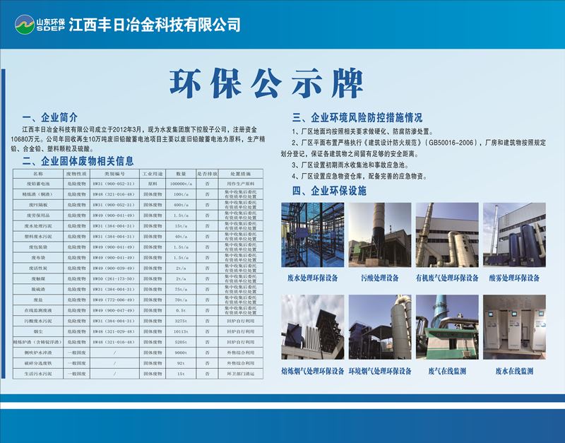江西豐日冶金科技有限公司江西豐日冶金科技有限公司成立于2012年3月,注冊(cè)資金15000萬(wàn)元,現(xiàn)為山東環(huán)保集團(tuán)旗下控股子公司,落戶(hù)于江西省宜春市袁州醫(yī)藥工業(yè)園。公司年回收再生十萬(wàn)噸廢舊鉛酸蓄電池項(xiàng)目占地62.41畝,總建筑面積42180㎡,總投資3.5億元,于2020年5月份投入生產(chǎn),自生產(chǎn)以來(lái)運(yùn)行穩(wěn)定,年產(chǎn)值達(dá)10億元以上,年納稅1億元以上。